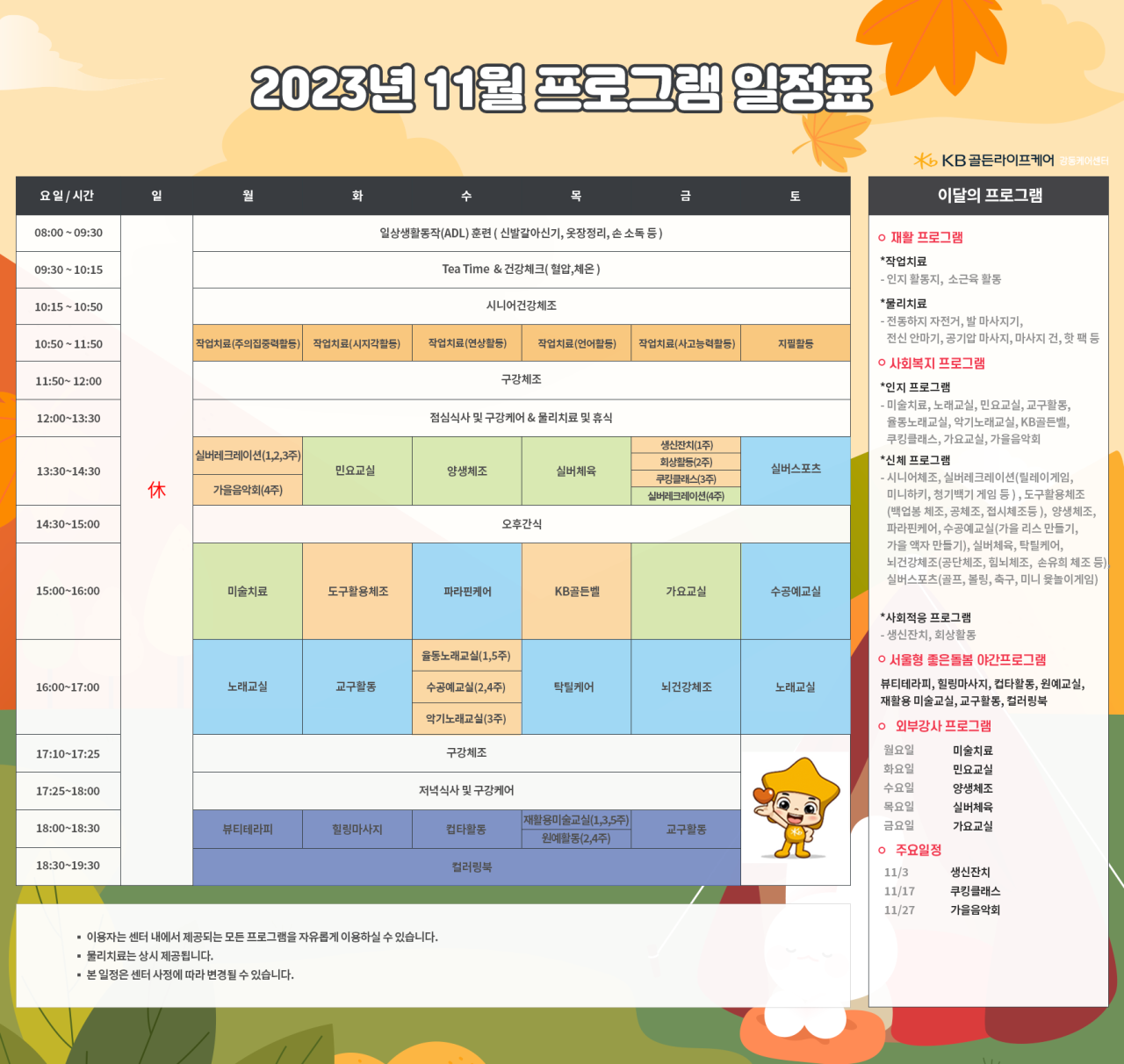 강동케어센터 [프로그램 안내] 2023년 강동케어센터 11월 프로그램 일정표 페이지 정보 작성자 KB 골든라이프케어 댓글 0건 조회 3,180회 작성일 23-10-31 08:29 목록 게시판 리스트 옵션 검색 본문 목록 이전글[식단안내] 2023년 강동케어센터 11월 식단표 23.10.31 다음글[ 오늘의 식단 ] 2023년 10월 26일 목요일 23.10.26