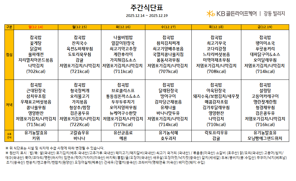 강동케어센터 [식단안내]강동케어센터 12월 3주차 주간식단표 페이지 정보 작성자 최고관리자 댓글 0건 조회 296회 작성일 25-12-12 15:43 목록 게시판 리스트 옵션 검색 본문 목록 이전글[오늘의 식단] 25년 12월 12일 금요일 중식 25.12.12 다음글[오늘의 식단] 25년12월 1일 월요일 중식 25.12.05