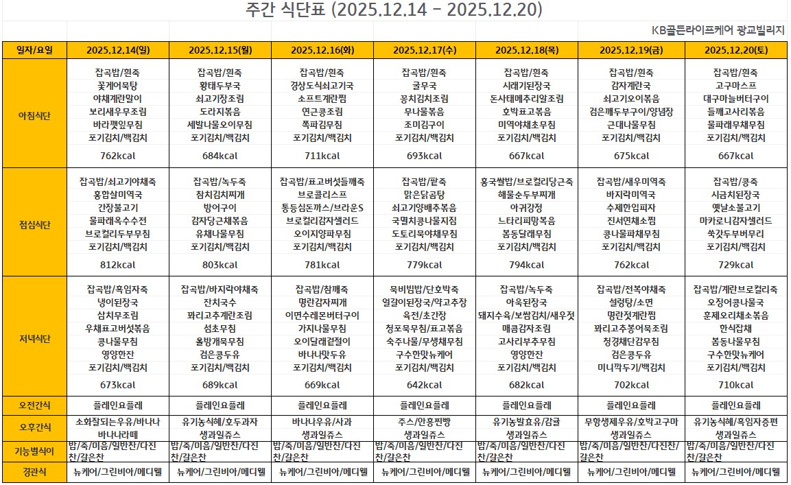 광교빌리지 [식단안내] 광교빌리지 12월 3주차 식단표 페이지 정보 작성자 최고관리자 댓글 0건 조회 285회 작성일 25-12-12 15:29 목록 게시판 리스트 옵션 검색 본문 목록 이전글[식단안내] 광교빌리지 12월 4주차 식단표 25.12.19 다음글[하루의 식단] 2025년 12월 9일 25.12.12