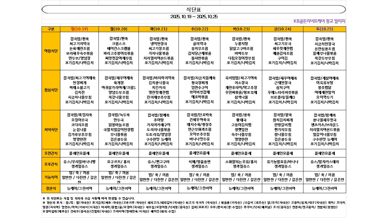 광교빌리지 [식단안내] 2025년 10월 4주차 주간식단표 페이지 정보 작성자 최고관리자 댓글 0건 조회 27회 작성일 25-10-16 10:05 목록 본문 목록 이전글[식단안내] 2025년 10월 4주차 식단표 25.10.17 다음글[하루의 식단] 2025년 10월 14일 25.10.16