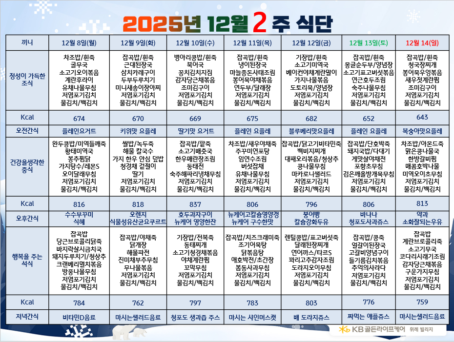 위례빌리지 [식단안내] 2025년 12월 2주차 식단표 페이지 정보 작성자 최고관리자 댓글 0건 조회 9회 작성일 25-12-05 13:11 목록 본문 목록 이전글[오늘의 식단] 2025년 12월 5일 중식 25.12.05 다음글[식단안내] 2025년 12월 2주차 식단표 25.12.05