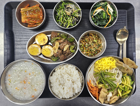 잡곡밥/당근브로콜리닭죽/ 잔치국수/ 한우장조림/ 시금치무침/ 올방개묵무침/ 저염포기김치
