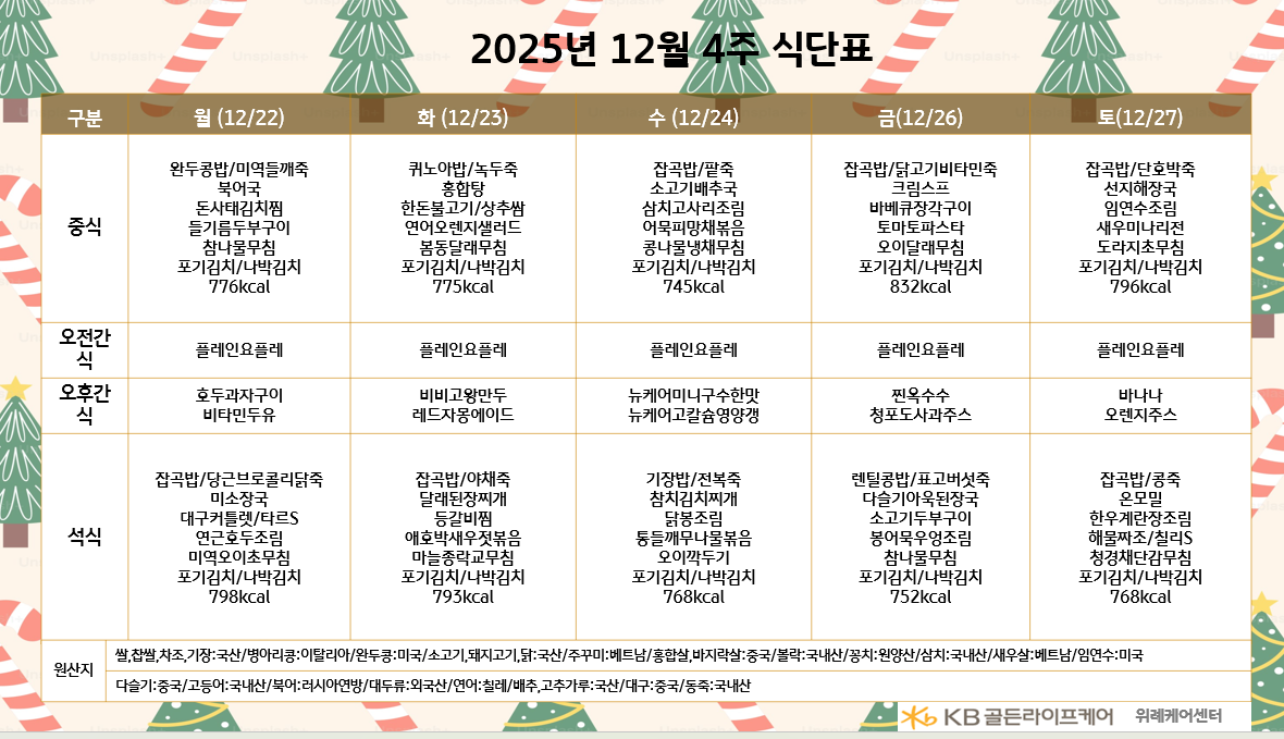 위례케어센터 [식단안내] 2025년 12월 4주차 식단표 페이지 정보 작성자 최고관리자 댓글 0건 조회 6회 작성일 25-12-18 15:51 목록 본문 목록 이전글[식단안내] 2025년 12월 4주차 식단표 25.12.18 다음글[오늘의 식단] 2025년 12월 17일 중식 및 석식 25.12.17