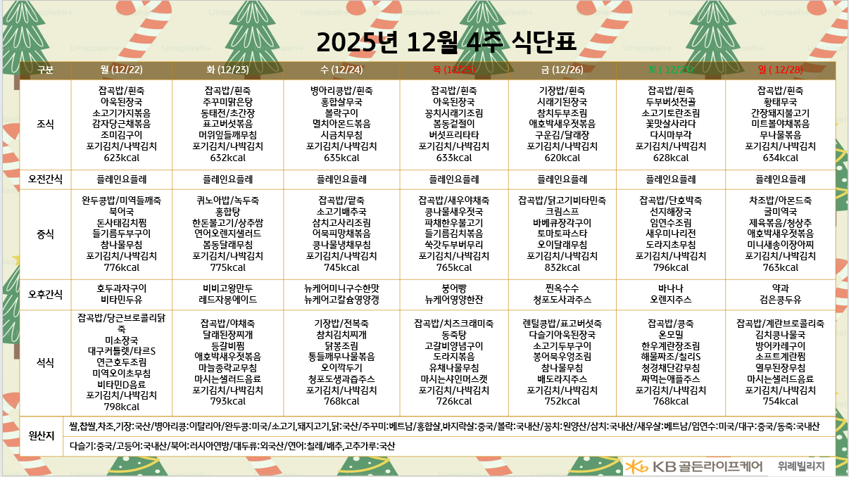 위례빌리지 [식단안내] 2025년 12월 4주차 식단표 페이지 정보 작성자 최고관리자 댓글 0건 조회 10회 작성일 25-12-18 15:52 목록 본문 목록 이전글[하루의 식단]강동빌리지 12월 17일 수요일 25.12.19 다음글[식단안내] 2025년 12월 4주차 식단표 25.12.18