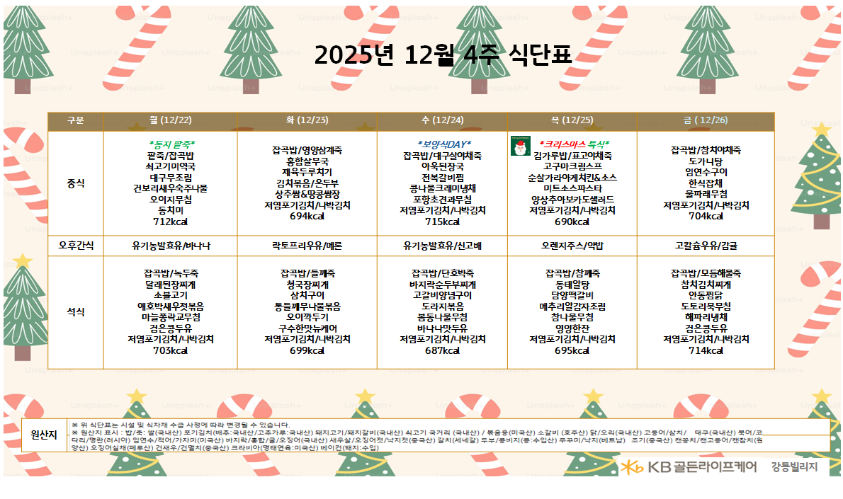 강동케어센터 [식단안내]강동케어센터 12월 4주차 주간식단표 페이지 정보 작성자 최고관리자 댓글 0건 조회 3회 작성일 25-12-19 16:09 목록 본문 목록 이전글[식단안내] 광교빌리지 12월 4주차 식단표 25.12.19 다음글[오늘의 식단] 25년 12월 17일 수요일 중식 25.12.19