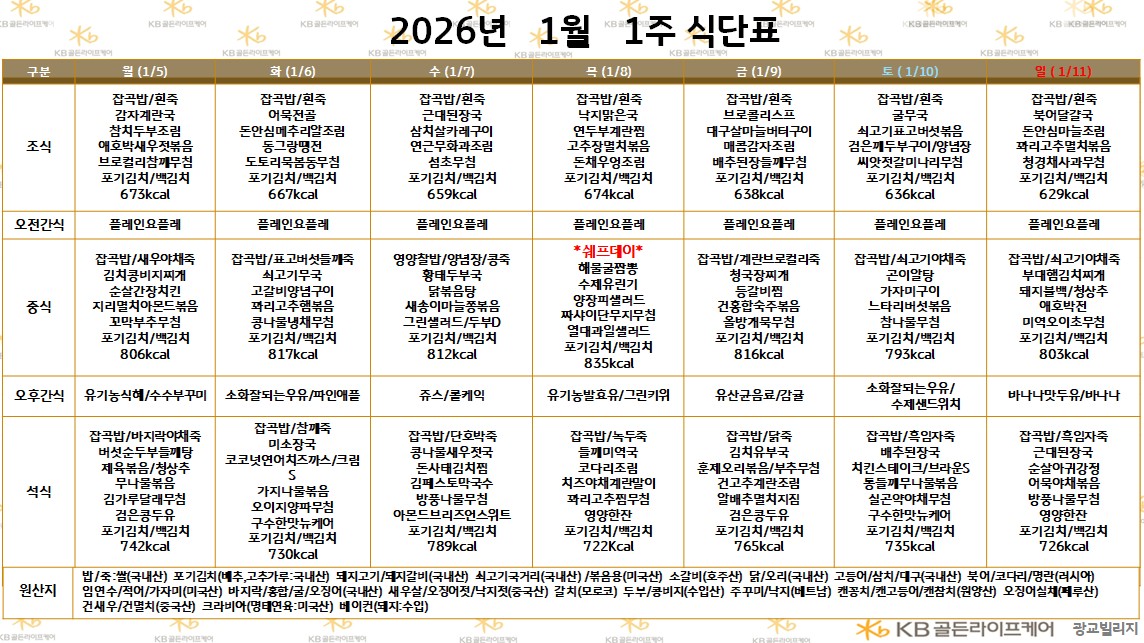 광교빌리지 [식단안내] 2026년 1월 1주 식단표 페이지 정보 작성자 최고관리자 댓글 0건 조회 107회 작성일 26-01-02 14:10 목록 본문 목록 이전글[식단안내] 2026년 1월 1주차 식단표 26.01.02 다음글[하루의 식단] 2025년 12월 30일 26.01.02