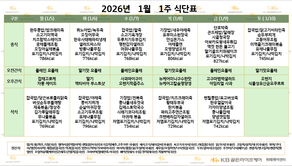 위례케어센터 [식단안내] 2026년 1월 1주차 식단표 페이지 정보 작성자 최고관리자 댓글 0건 조회 91회 작성일 26-01-02 14:54 목록 본문 목록 이전글[식단안내] 2026년 1월1주차 식단표 26.01.02 다음글[식단안내] 2026년 1월 1주 식단표 26.01.02