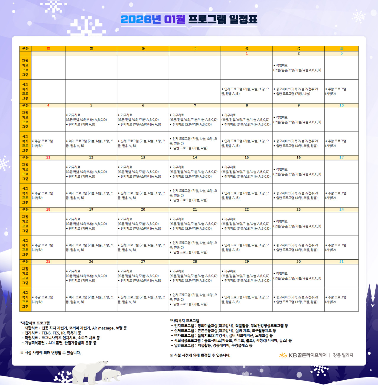 강동빌리지 [프로그램 안내] 2026년 강동 빌리지 1월 프로그램 일정표 페이지 정보 작성자 최고관리자 댓글 0건 조회 83회 작성일 26-01-02 16:09 목록 본문 목록 이전글[하루의 식단]강동빌리지 12월 30일 화요일 26.01.02 다음글[식단안내] 2026년 1월1주차 식단표 26.01.02