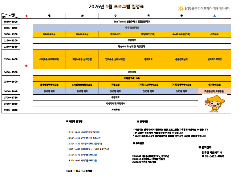 위례케어센터 [프로그램 안내] 2026년 위례케어센터 1월 프로그램 일정표 페이지 정보 작성자 최고관리자 댓글 0건 조회 22회 작성일 26-01-05 10:18 목록 본문 목록 이전글[프로그램 안내] 2026년 은평케어센터 1월 프로그램 일정표 26.01.06 다음글[식단안내] 2026년 1월 1주차 식단표 26.01.05