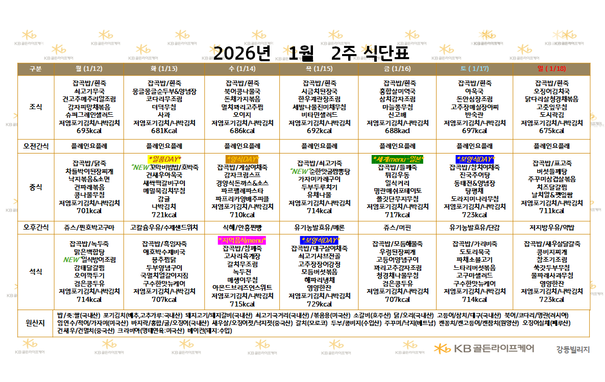 강동빌리지 [식단안내] 2026년 1월 2주 식단표 페이지 정보 작성자 최고관리자 댓글 0건 조회 6회 작성일 26-01-09 15:53 목록 본문 목록 이전글[식단안내] 2025년 1월 2주 식단표 26.01.09 다음글[오늘의 식단] 25년 1월 5일 월요일 중식 26.01.09