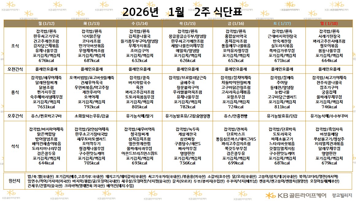 광교빌리지 [식단안내] 2026년 1월 2주 식단표 페이지 정보 작성자 최고관리자 댓글 0건 조회 15회 작성일 26-01-09 17:30 목록 본문 목록 이전글[식단안내] 2026년 1월 2주차 식단표 26.01.09 다음글[하루의 식단] 2026년 1월 8일 26.01.09