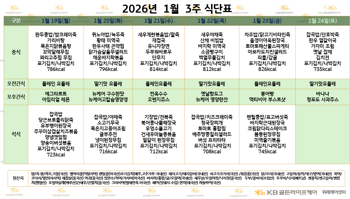 위례케어센터 [식단안내] 2026년 1월 3주차 식단표 페이지 정보 작성자 최고관리자 댓글 0건 조회 16회 작성일 26-01-15 17:18 목록 본문 목록 이전글[식단안내] 2026년 1월 3주차 식단표 26.01.15 다음글[오늘의 식단] 2026년 1월 15일 중식 및 석식 26.01.15