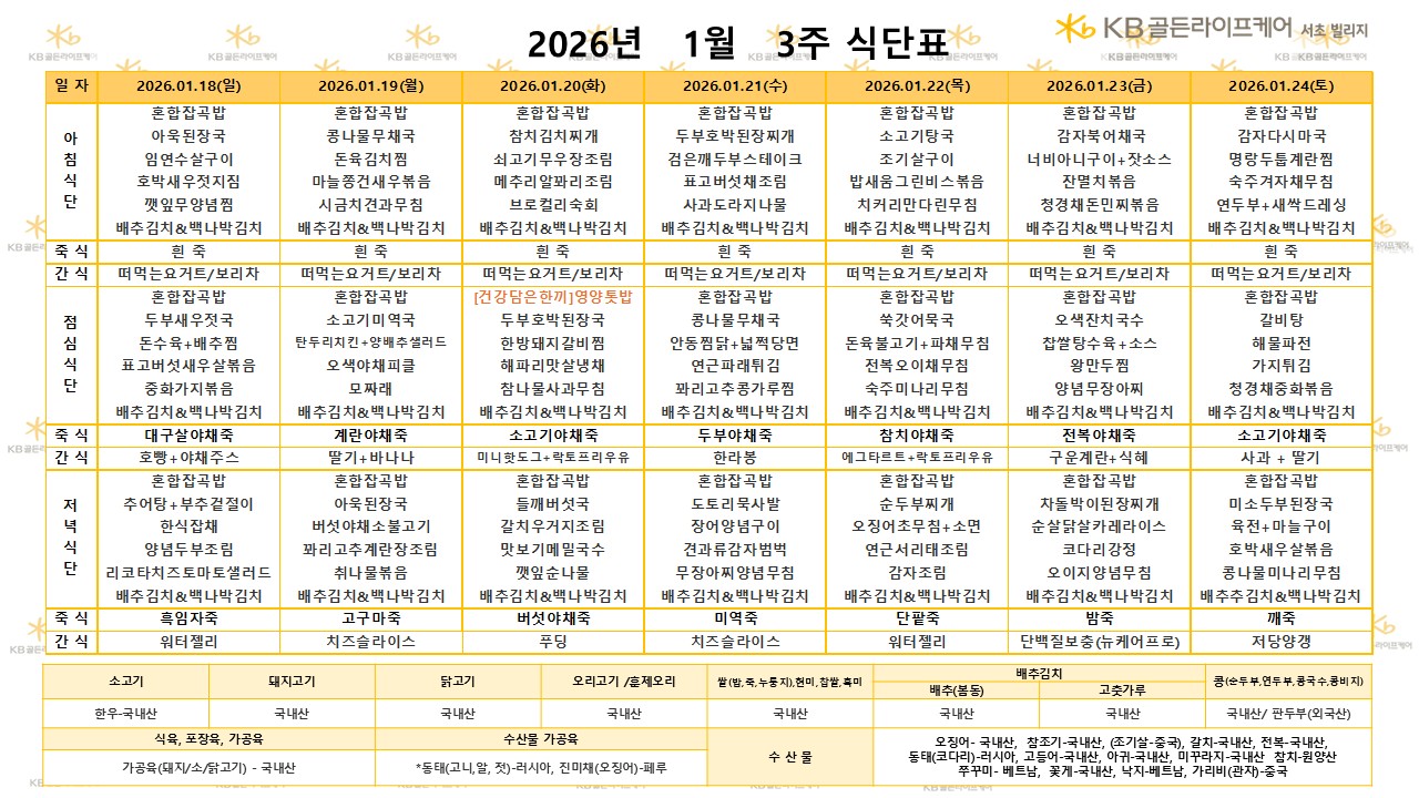 서초빌리지 [식단안내] 2026년 01월 3주차 식단표