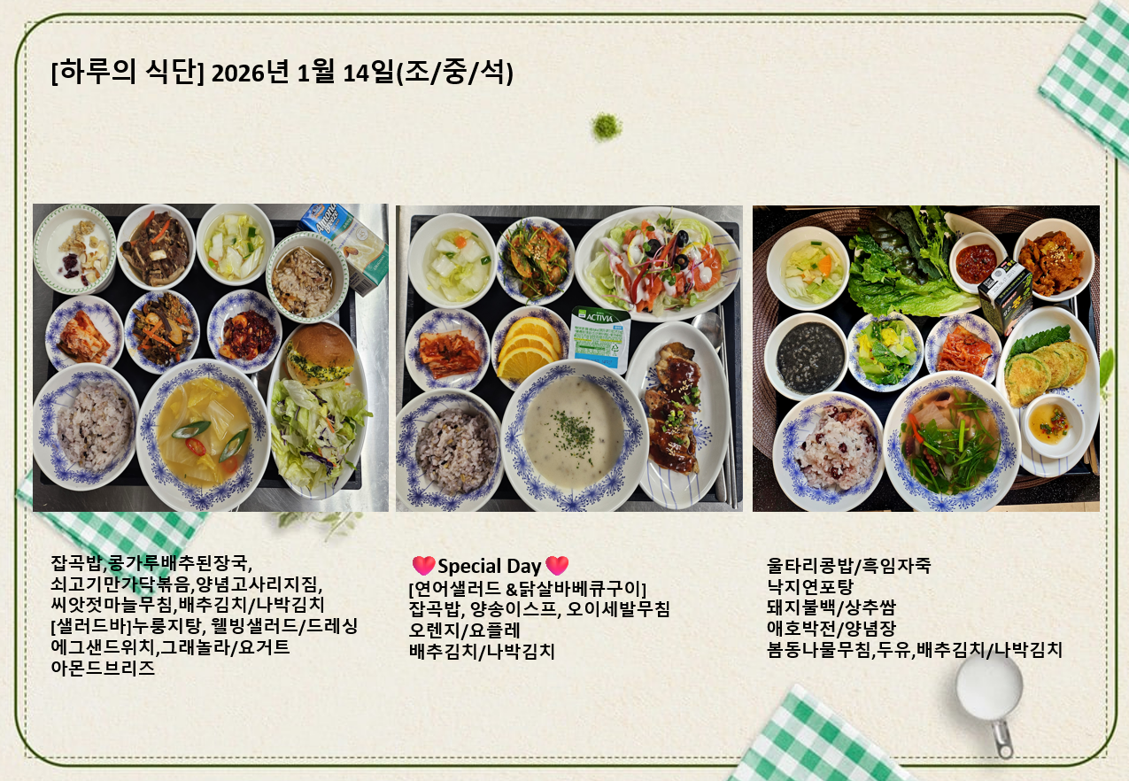 평창카운티 [하루의 식단] 2026년 1월 14일 (조/중/석) 페이지 정보 작성자 최고관리자 댓글 0건 조회 13회 작성일 26-01-19 01:39 목록 본문 목록 이전글[식단안내] 2026년 1월 3주차 식단표 26.01.19 다음글[식단안내] 2026년 01월 3주차 식단표 26.01.16
