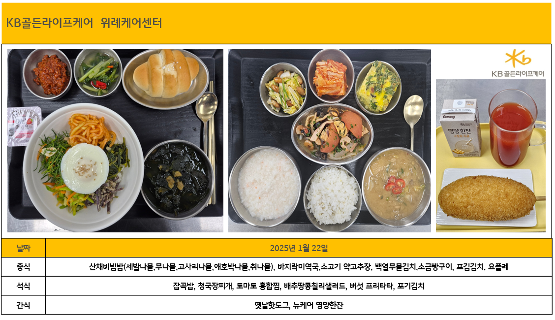 위례케어센터 [오늘의 식단] 2026년 1월 22일 중식 및 석식 페이지 정보 작성자 최고관리자 댓글 0건 조회 4회 작성일 26-01-22 17:44 목록 본문 목록 이전글[식단안내] 2026년 1월 4주차 식단표 26.01.22 다음글[식단안내] 2026년 1월 3주차 식단표 26.01.19