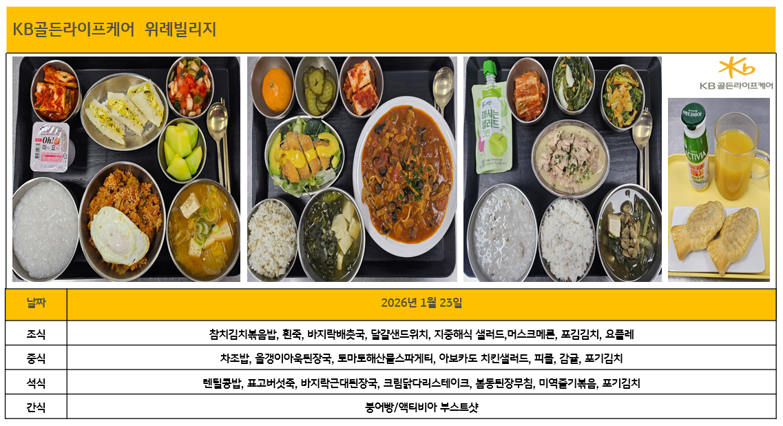 위례빌리지 [하루의식단] 2026년 1월 23일 페이지 정보 작성자 최고관리자 댓글 0건 조회 4회 작성일 26-01-23 16:32 목록 본문 목록 이전글[하루의 식단]강동빌리지 1월 21일 수요일 26.01.23 다음글[식단안내] 2026년 1월 4주차 식단표 26.01.22