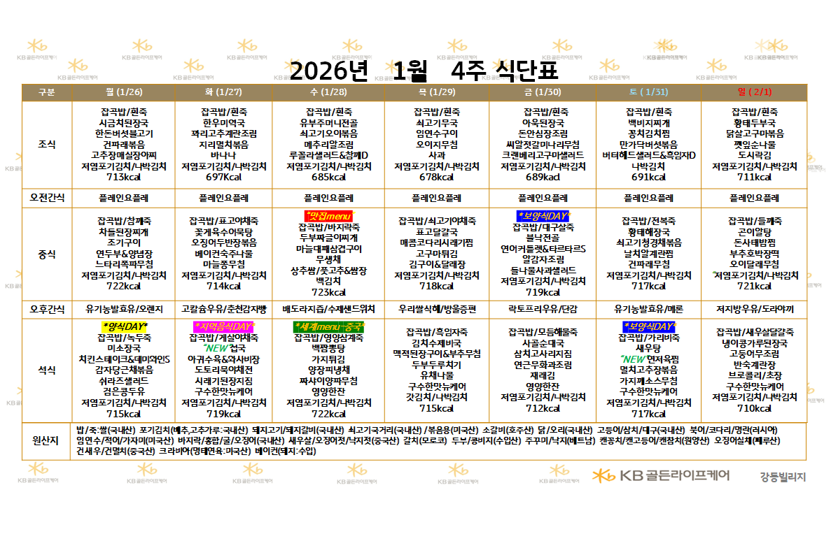 강동빌리지 [식단안내] 2026년 1월 4주 식단표 페이지 정보 작성자 최고관리자 댓글 0건 조회 3회 작성일 26-01-23 16:44 목록 본문 목록 이전글[하루의 식단] 2026년 1월 20일 26.01.23 다음글[식단안내] 2025년 1월 4주 식단표 26.01.23