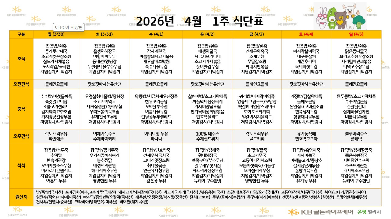 은평빌리지 [식단안내] 2026년 4월 1주차 식단표 페이지 정보 작성자 최고관리자 댓글 0건 조회 324회 작성일 26-03-28 11:54 목록 본문 목록 이전글[하루의 식단] 2026년 3월 25일 (조/중/석) 26.03.30 다음글[하루의식단] 2026년 3월 27일 조/중/석식 26.03.28