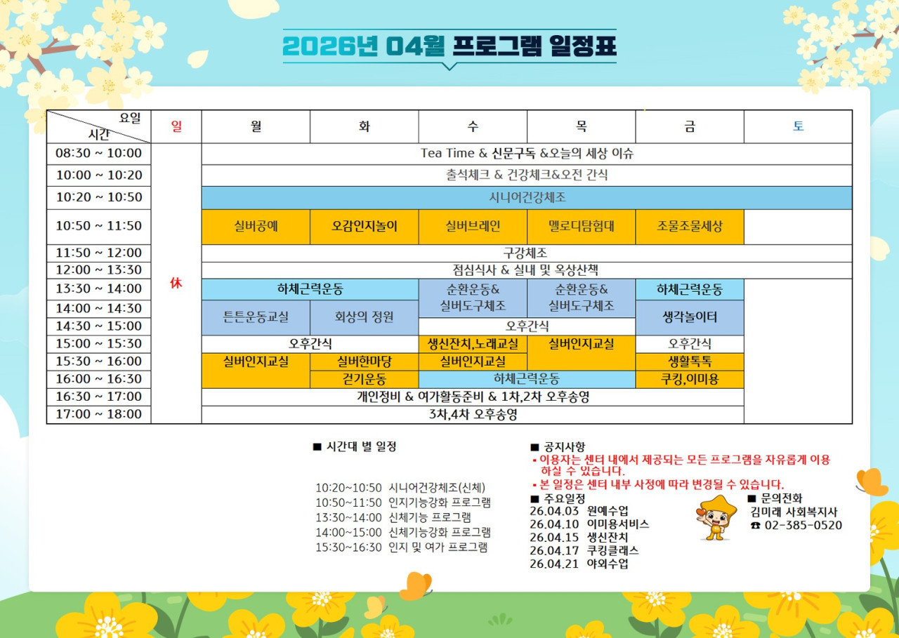 은평케어센터 [프로그램 안내] 2026년 은평 케어센터 4월 프로그램 일정표 페이지 정보 작성자 최고관리자 댓글 0건 조회 173회 작성일 26-03-31 14:19 목록 본문 목록 이전글[프로그램 안내] 2026년 강동 빌리지 4월 프로그램 일정표 26.03.31 다음글[프로그램 안내]2026년 위례 빌리지 4월 프로그램 일정표 26.03.31