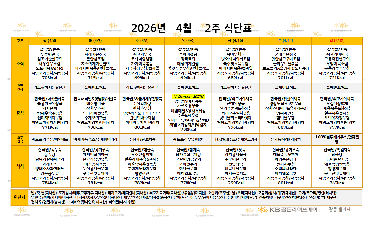 강동빌리지 [식단안내] 2026년 4월 2주 식단표 페이지 정보 작성자 최고관리자 댓글 0건 조회 25회 작성일 26-04-03 18:00 목록 본문 목록 이전글[식단안내] 2026년 4월 2주 식단표 26.04.03 다음글[식단안내] 2026년 4월 2주차 식단표 26.04.02