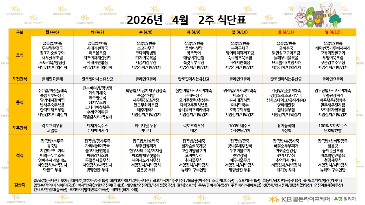 은평빌리지 [식단안내] 2026년 4월 2주차 식단표 페이지 정보 작성자 최고관리자 댓글 0건 조회 25회 작성일 26-04-05 10:53 목록 본문 목록 이전글[하루의식단] 2026년 3월 31일 중식 26.04.05 다음글[하루의식단] 2026년 4월 1일 조식/중식/석식 26.04.05