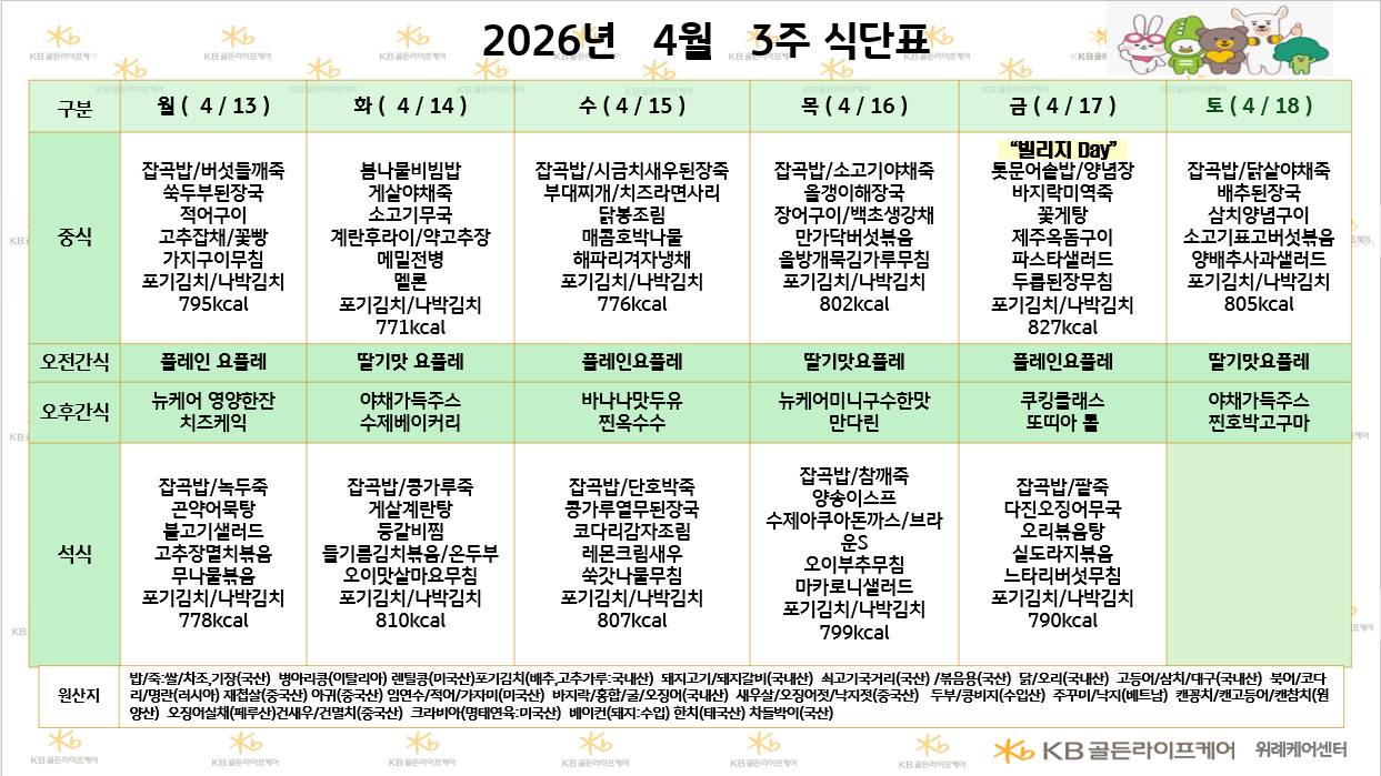 위례케어센터 [식단안내] 2026년 4월 3주차 식단표 페이지 정보 작성자 최고관리자 댓글 0건 조회 7회 작성일 26-04-08 07:51 목록 본문 목록 이전글[식단안내] 4월 3주차 식단표 26.04.08 다음글[식단안내] 2026년 4월 2주차 식단표 26.04.06